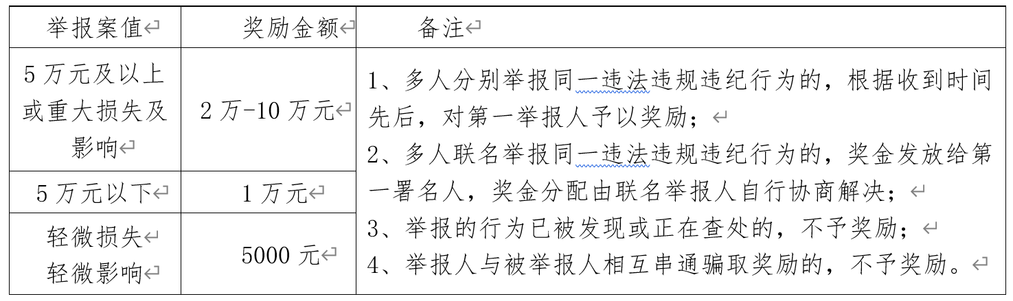 三、舉報(bào)內(nèi)容一經(jīng)查實(shí),公司給予舉報(bào)人獎(jiǎng)勵(lì),具體標(biāo)準(zhǔn)如下表所示: